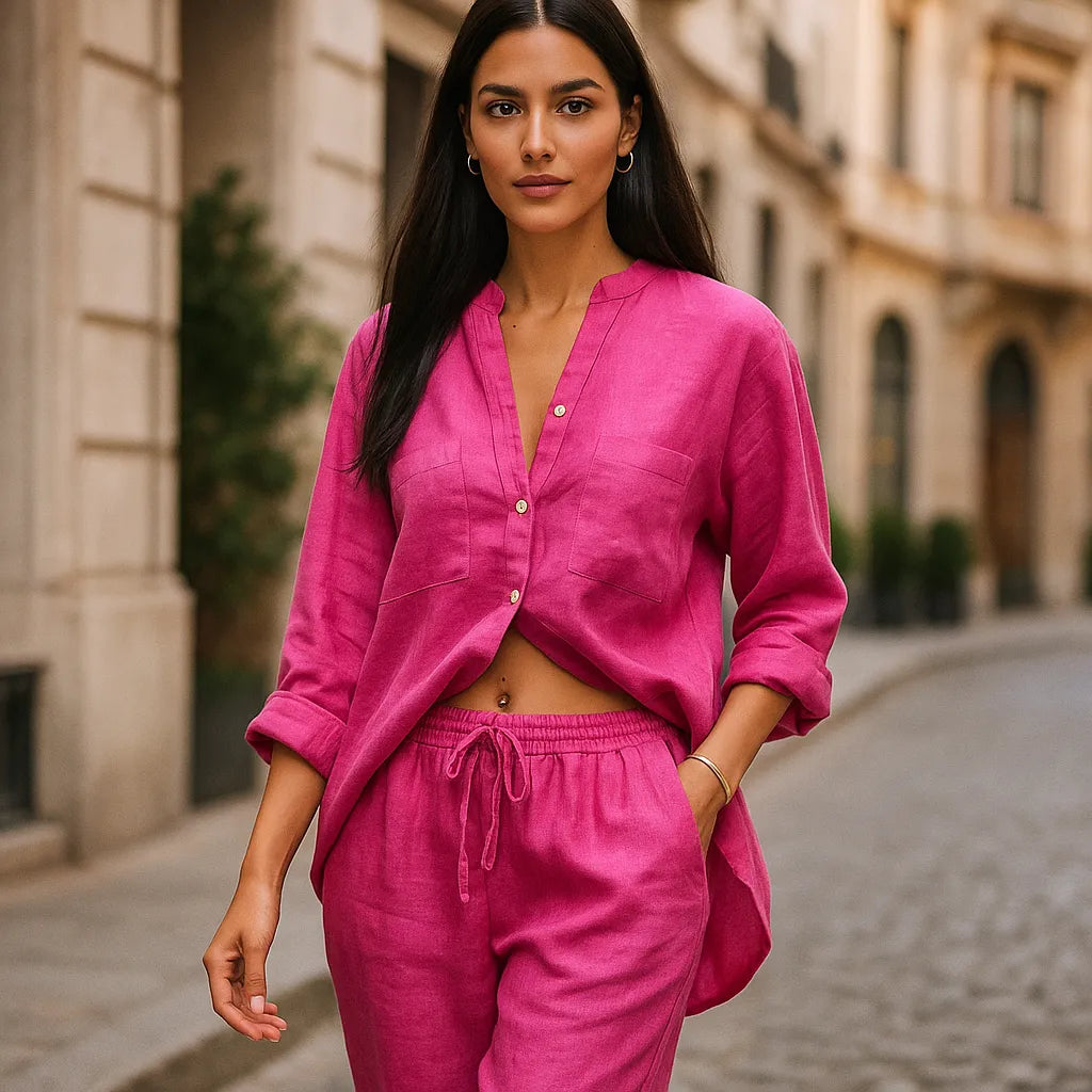 El Conjunto Boreal está confeccionado con suave seda hindú, un tejido ligero y fluido que te mantiene fresca durante todo el día. Su diseño moderno se adapta a cualquier ocasión: días soleados, salidas casuales o incluso trabajo desde casa con estilo.