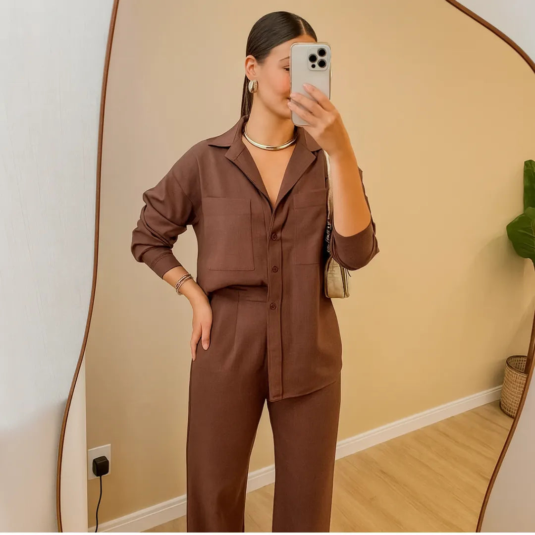 El Conjunto Verona es la definición del estilo elegante sin esfuerzo. Con su camisa amplia y pantalón de corte recto, logra un equilibrio perfecto entre comodidad y sofisticación.