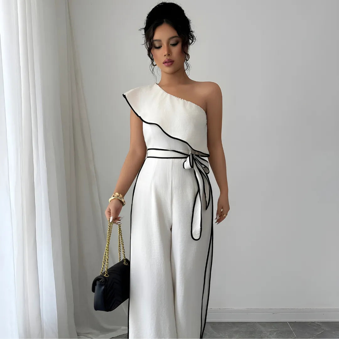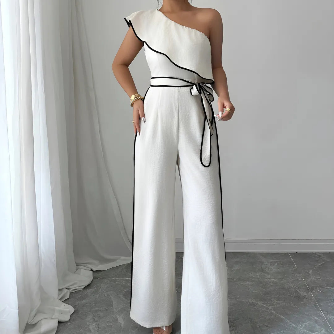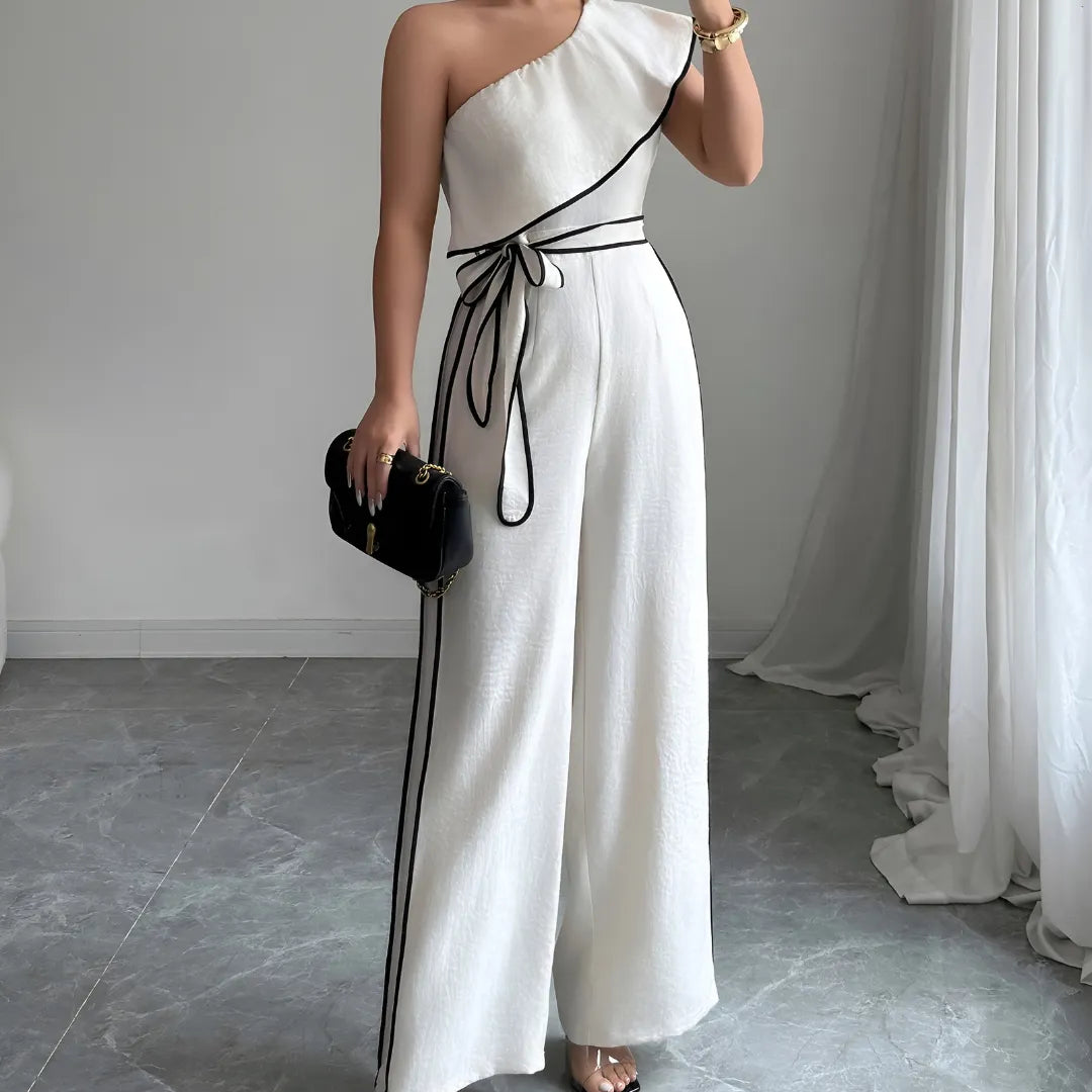 Con su corte asimétrico de un solo hombro y caída amplia, el Mono Infinity Grace redefine la elegancia contemporánea. Su cinturón ajustable enmarca la cintura con sutileza, mientras el tejido fluido aporta ligereza y presencia en cada paso.
