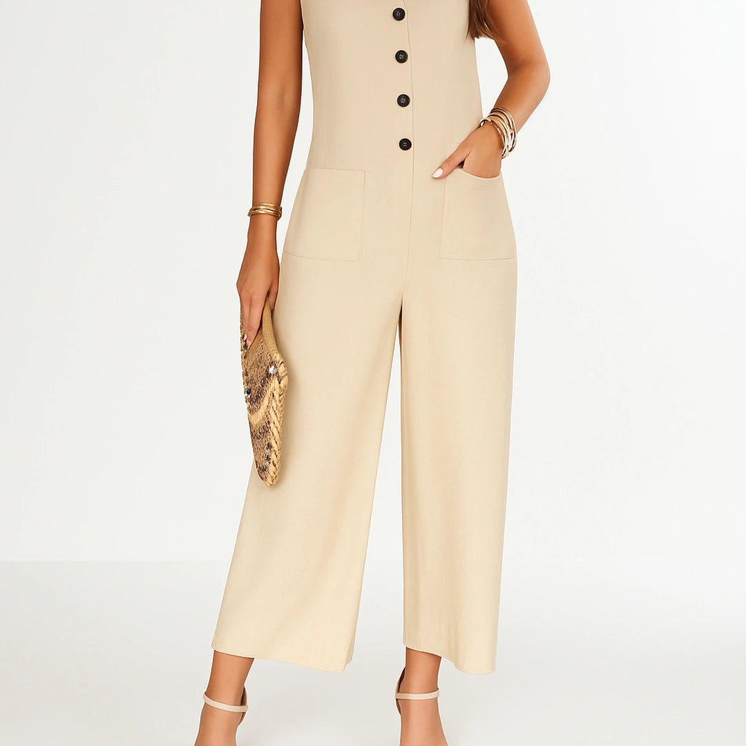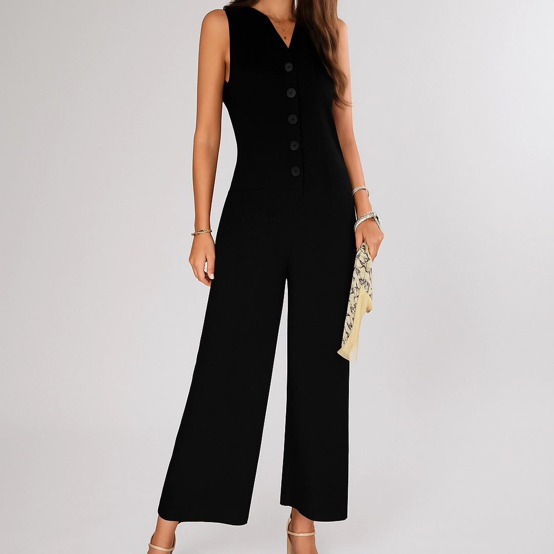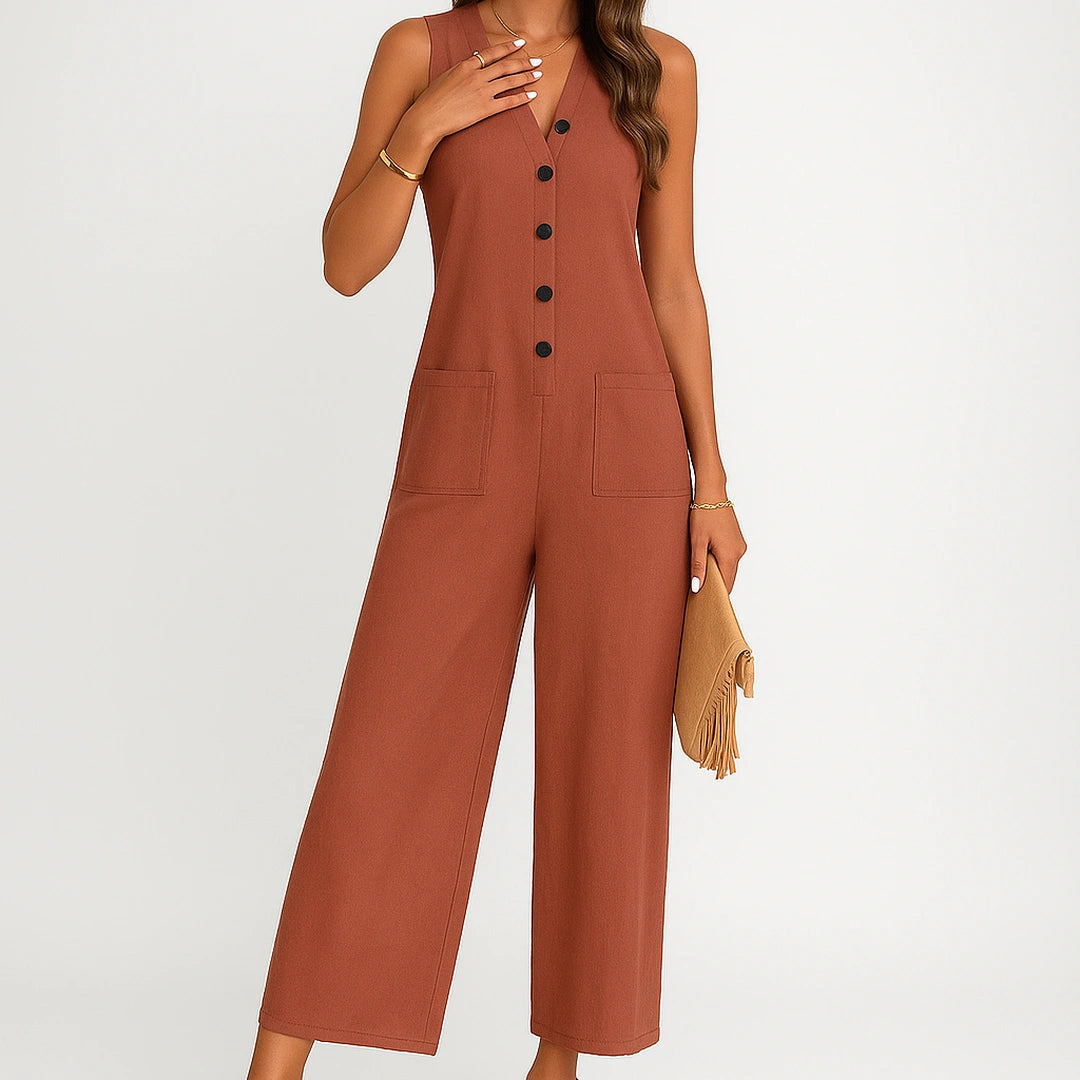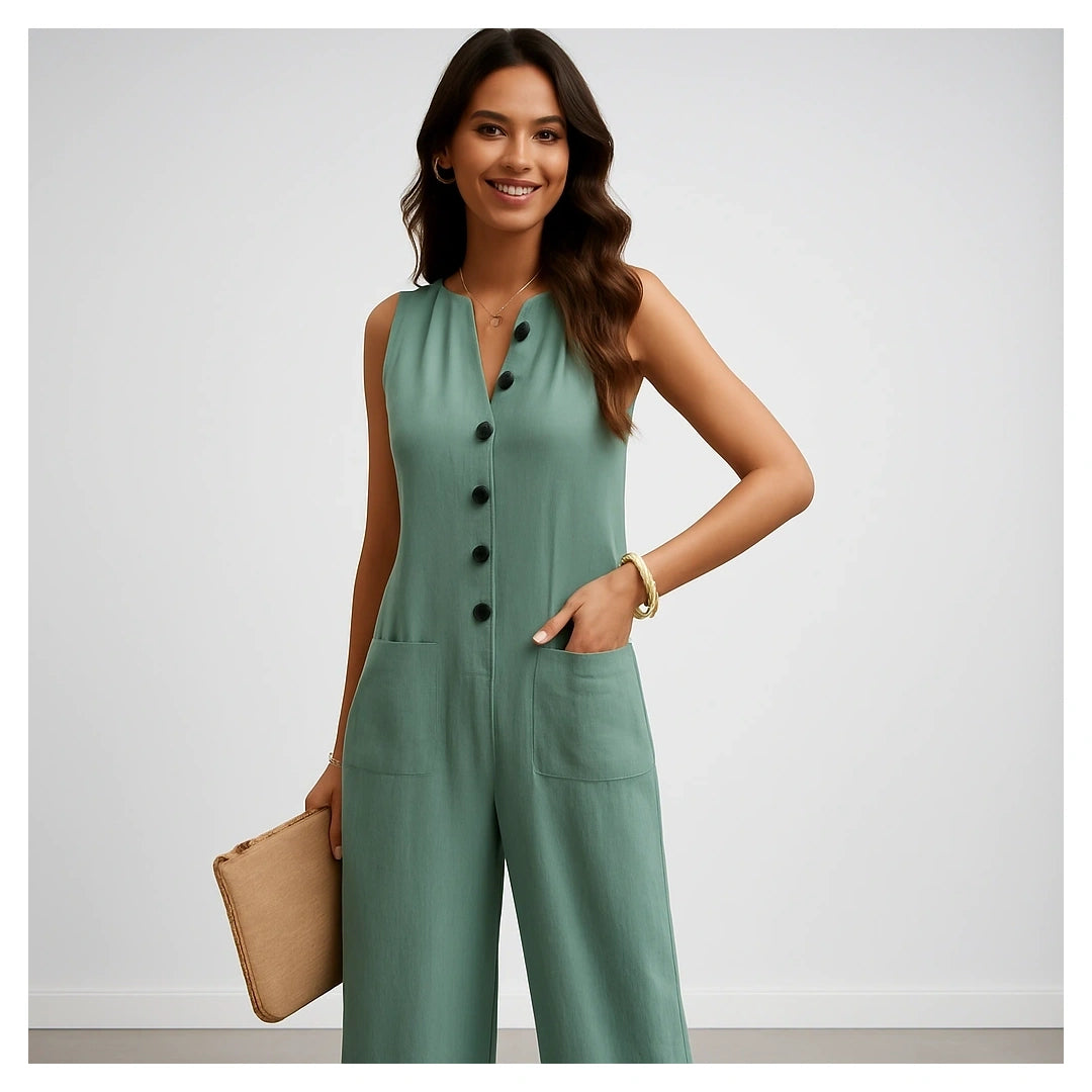 El Riviera Flow redefine el equilibrio entre estilo y confort. Su diseño sin mangas estiliza los hombros, mientras el corte amplio de las piernas crea una figura esbelta y libre. Es la prenda ideal para quienes buscan sentirse seguras, cómodas y naturalmente sofisticadas, sin renunciar a la practicidad.